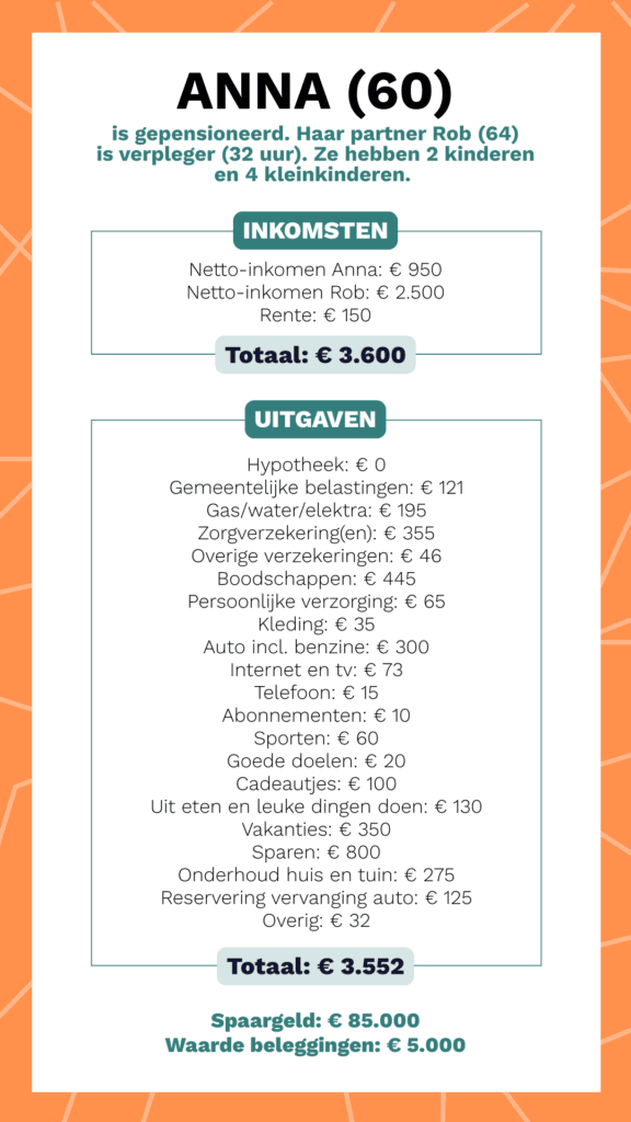 Anna (60) is vervroegd uitgetreden! Samen met haar partner Rob (64), die nog parttime werkt, geniet ze van een welverdiend leven als pensionado. Hoe regelen ze nu hun financiën? Duik mee in hun kasboekje.
