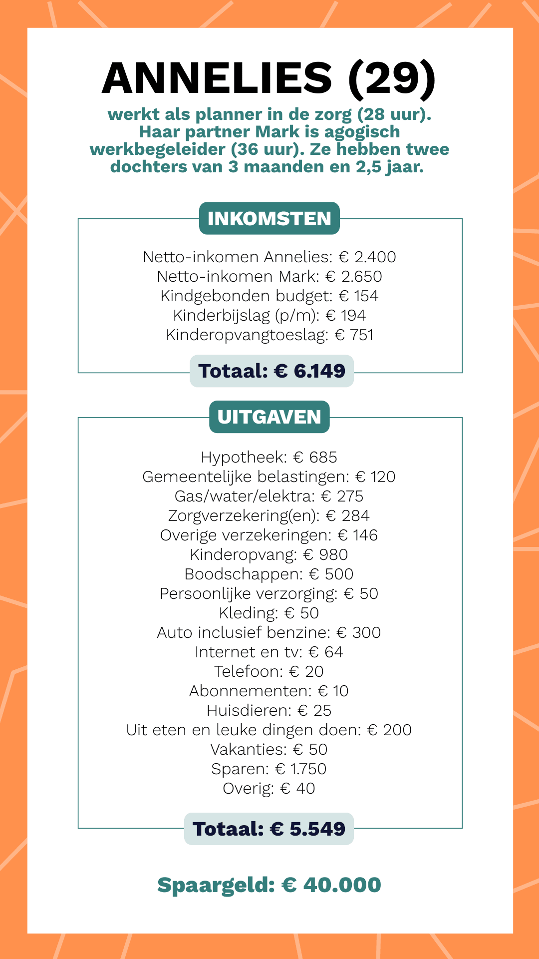 “Bizar, hè? In 2021 kochten we ons huis voor € 240.000. We legden € 40.000 eigen geld in en kwamen zo uit op een hypotheek van € 200.000. Met een rente van 1,28% zitten we echt goed. Daardoor houden we veel ruimte over om te sparen.”