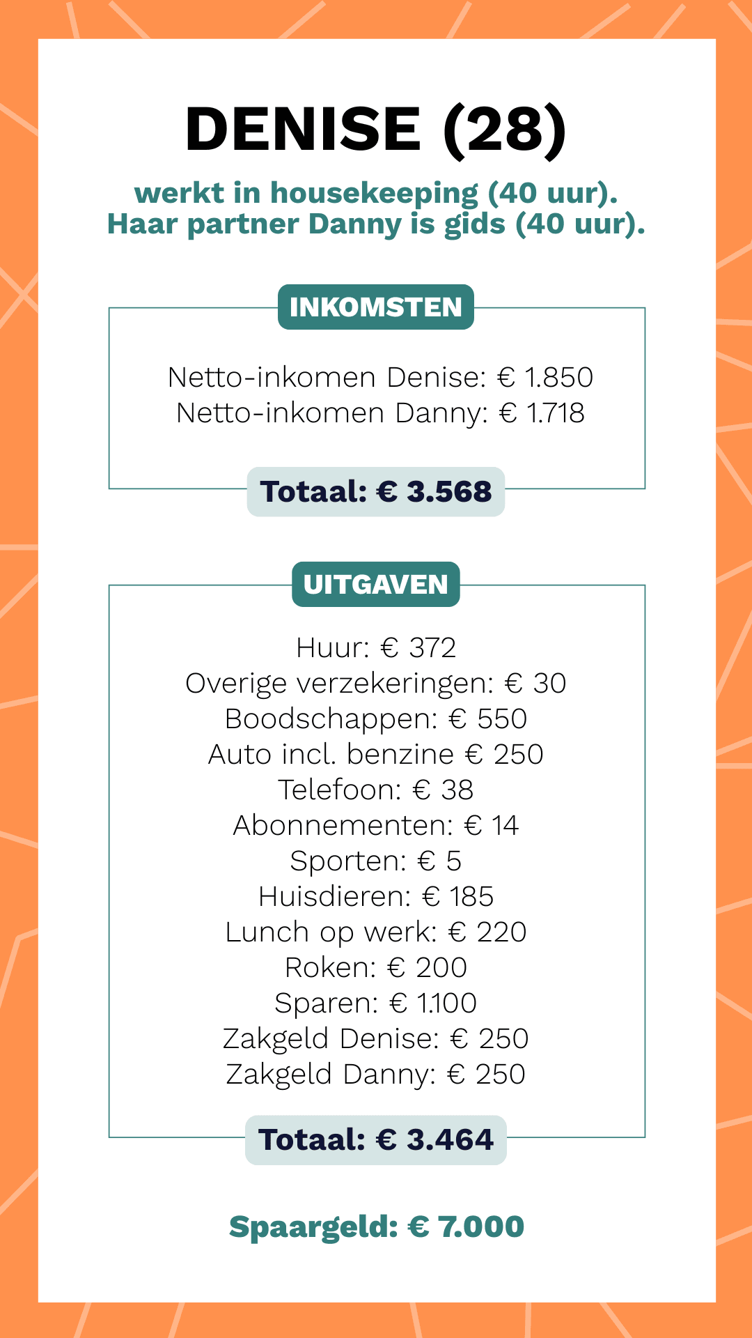 Denise (28) en haar vriend Danny wonen in Zweden. Ze werken allebei fulltime en verdienen daarmee € 3.568 netto per maand. Onlangs kochten ze hun droomhuis – voor nog geen ton.