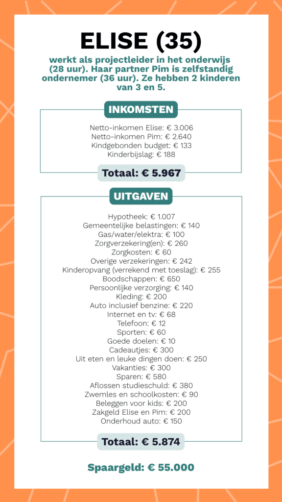 Elise (35) woont met haar vriend Pim en hun twee kinderen van 3 en 5 jaar in een fijne tussenwoning. Thuis is ze het financiële brein en zorgt ze dat ze elke maand weer netjes uitkomen. Al is dat soms wel een hele uitdaging. Kijk je mee in hun kasboekje?