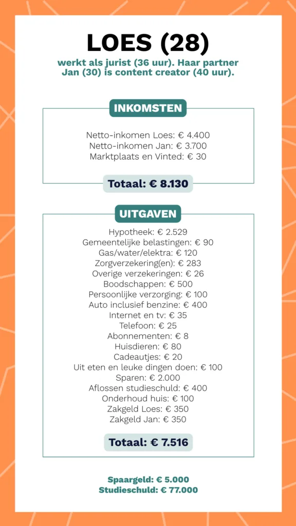 De hypotheek van Loes (28) en Jan (30) is met zo’n € 2.500 fors. Net als hun studieschuld! Die zijn ze al langzaam aan het aflossen én het lukt zelfs nog om een heel lekker bedrag te sparen per maand. Kijk mee in hun kasboekje.