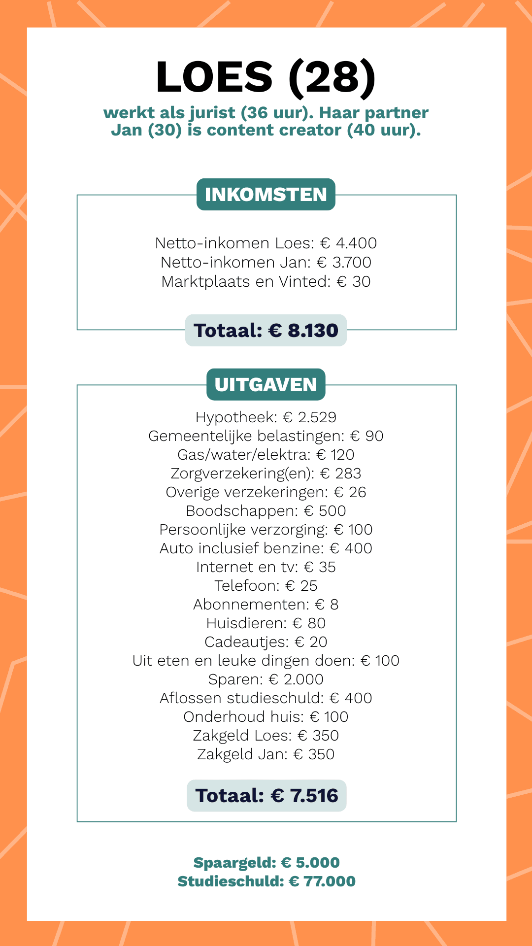 De hypotheek van Loes (28) en Jan (30) is met zo’n € 2.500 fors. Net als hun studieschuld! Die zijn ze al langzaam aan het aflossen én het lukt zelfs nog om een heel lekker bedrag te sparen per maand. Kijk mee in hun kasboekje.