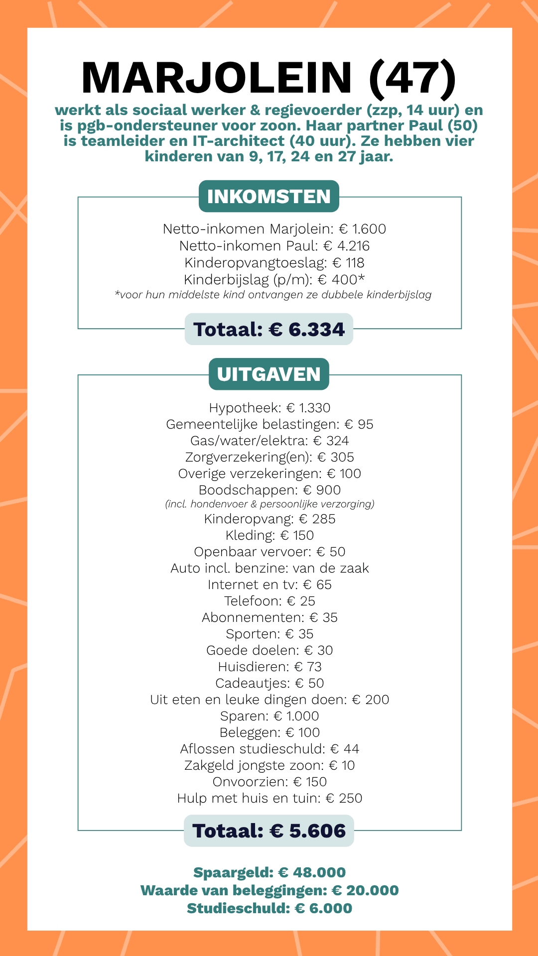 “Klopt. Dat is alleen voor de jongste. Die krijgt elke week € 2,50 contant. Het meeste spaart hij en af en toe koopt hij er wat voor in de voetbalkantine of kringloopwinkel. De middelste van 17 heeft een matig verstandelijke beperking en heeft geen weet van geld. Daar regel ik alles voor. En de oudste twee kregen toen ze nog thuis woonden kleedgeld en zakgeld volgens de Nibud-norm.”